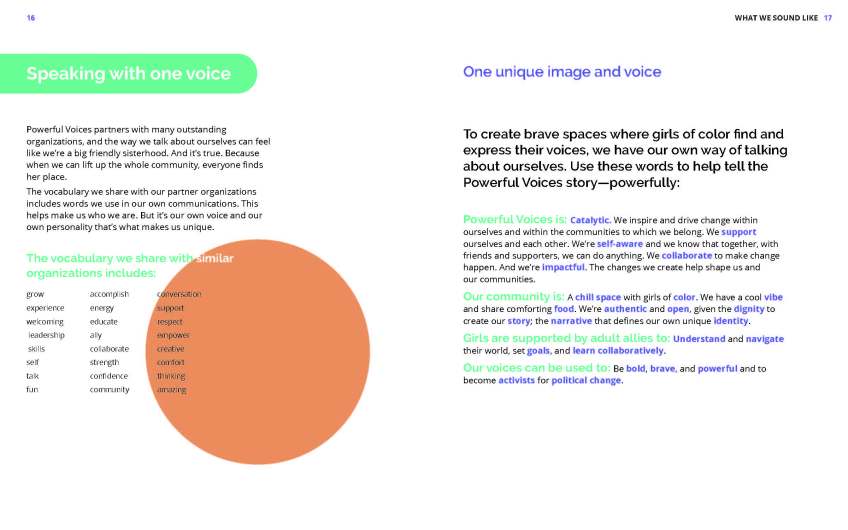 As part of a pro-bono team in the 2018 AIGA Changemakers Series, I helped with communication and brand strategy, and wrote the bulk of the content for this brand book. It was created for Powerful Voices, a Seattle non-profit that supports girls of color.