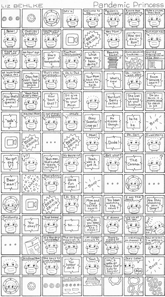 This micro-panel comic was run in the March 11 edition of The Stranger (Seattle) on the same day COVID-19 was declared a global pandemic. I made the comic with empathy for those who are being quarantined (or self-quarantined) and love for friends and family members who care in the best way they can.