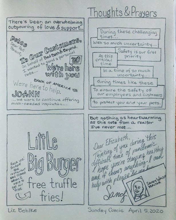 Fiction Thoughts and Prayers Date: April 6, 2020Author: Liz Behlke This is my Sunday Comic for April 5, 2020 Copyright 2020, Liz Behlke