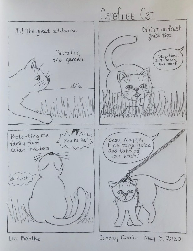 Fiction Carefree Cat Date: May 17, 2020Author: Liz Behlke An allegory of our time, or just a cat comic? You decide! Copyright Liz Behlke 2020
